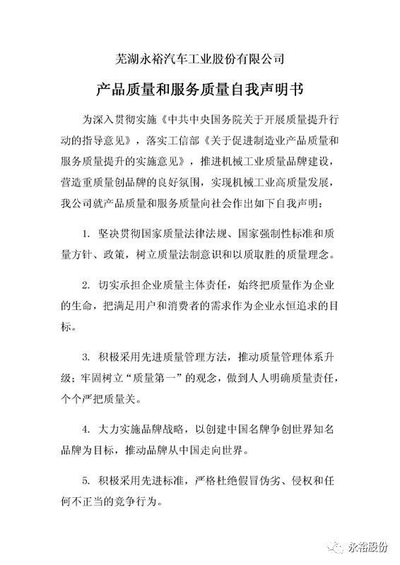 為深入貫徹實施《中共中央國務(wù)院關(guān)于開展質(zhì)量提升行動的指導(dǎo)意見》,落實工信部《關(guān)于促進制造業(yè)產(chǎn)品質(zhì)量和服務(wù)質(zhì)量提升的實施意見》,推進機械工業(yè)質(zhì)量品牌建設(shè),營造重質(zhì)量創(chuàng)品牌的良好氛圍,實現(xiàn)機械工業(yè)高質(zhì)量發(fā)展,我公司就產(chǎn)品質(zhì)量和服務(wù)質(zhì)量向社會作出自我聲明.